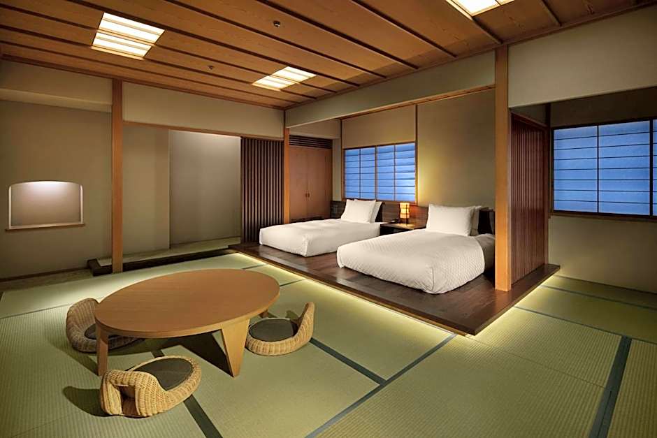 This twin room's special feature is the hot tub. The spacious twin room provides air conditioning, tatami, as well as a private bathroom featuring a bath and a shower. The twin room features a tea and coffee maker, a safe deposit box, heating and a flat-screen TV with satellite channels. The unit offers 2 beds and 6 futons.